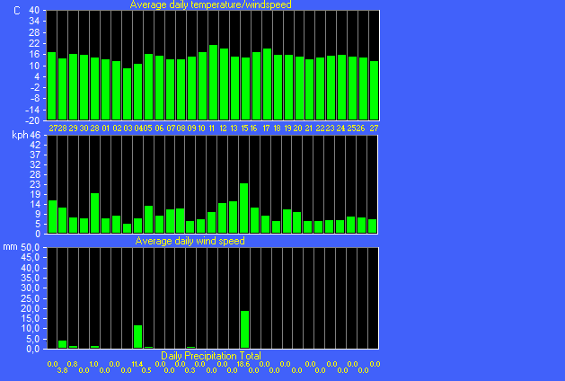 Maximum windspeed = 29.6 kmh from 219°( SW) on day 05 at time 17:18